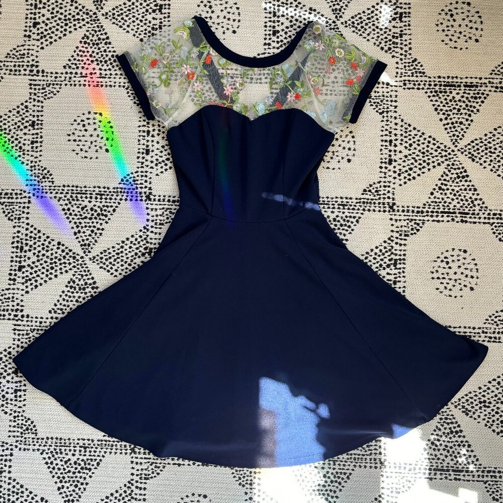 ModCloth navy dress with embroidered floral mesh neckline in size M