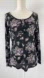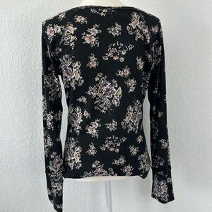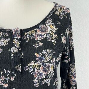 Floral waffle-knit henley top from ModCloth. Size L. Floral print with blue, pink, purple, and yellow flowers on black background. Scoop neck. Three functional buttons at collar.