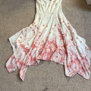 This dress has so many fun details! Button closure over an open back, beautiful flower design, and a handkerchief hem that creates such a fun shape! No obvious signs of wear.