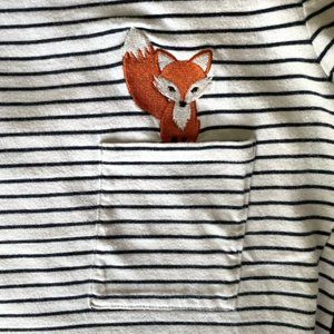 Top by ModCloth. Adorable embroidered fox peeks out from a small patch pocket on the front. White and navy blue striped. 3/4 length sleeves.