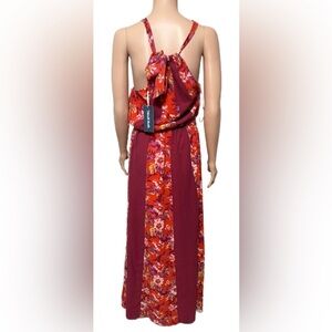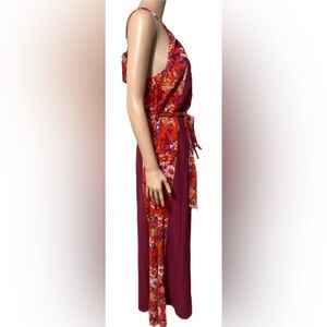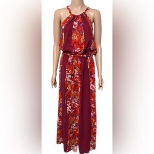 ModCloth Halter Maxi Dress M Red Floral Sleeveless Back Tie Belted Boho Summer