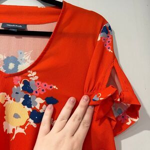 ModCloth brand “Ideal Discovery” Short Sleeve Blouse. this woven beauty takes your look to new levels of delight with tied sleeves on either side of its sleek V-neckline. And, with a contrast bouquet print added in, this lightweight blouse is a real a wardrobe treasure! Tag size medium. Gently worn.