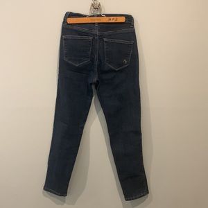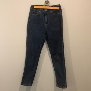 These are high-waisted, dark wash, cropped, stretchy denim from ModCloth. I think they fit slightly smaller than a 2. There is less stretch in the waist and a lot of stretch in the leg. Super cute and flattering!
