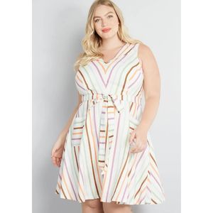 The feminine lapels, sash-tied waist, and patch pockets of this cotton-linen-blend dress from our ModCloth namesake label take cues from the past - and will have others taking note of such a nostalgic look. A gorgeous array of pastel stripes further enliven this white A-line wonder.