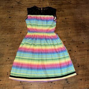 ModCloth Make the Cut, rainbow striped, black lace, sleeveless, Marra Mazzella dress. Approximately 17 inches from armpit to armpit, 13.5 inches across the waist, and 36.5 inches long. Side zipper. In good, used condition. From a pet and smoke free.