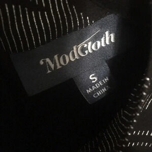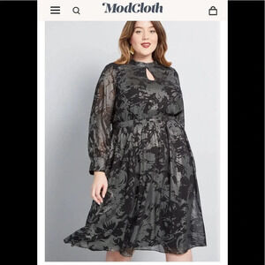 A silver-striped A-line rests an abstract motif in a solid black hue. Decorative buttons atop one shoulder and a flirty keyhole beneath a mock neck, this pocketed midi abounds with elements to appreciate.