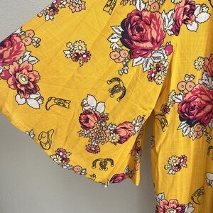 Bring on the sunshine with this brand new ModCloth wrap top! Featuring a flattering surplice neckline and adjustable tie at the hem, this kimono-style blouse blends playful florals with a whimsical western print—cowboy boots, horseshoes, and all. Lightweight and breezy, it’s perfect for summer days, beach outings, or festival fun.