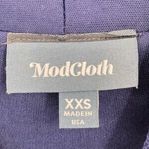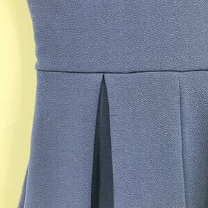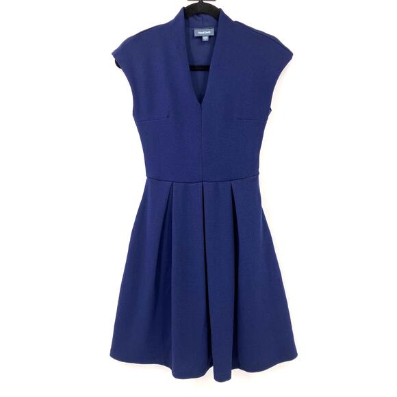 ModcCoth Navy Blue V Neck Cap Sleeve Pleated Lined Side Zip Pockets Lightweight Stretch Fit & Flare Cocktail Dress