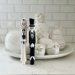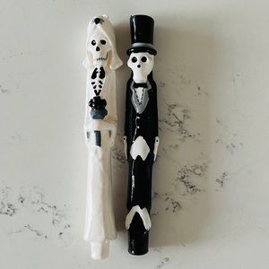ModCloth by one Hundred 80 degrees Newlydeads Candles. Set of 2. This pair of Dia de los Muertos candles might be too adorable to light up. Shaped as bride and groom skeletons, this pair of 10” candle sticks molded from black and white taper wax are so intricately detailed you might have to do a double-take to ensure these are indeed candles. If this candle set doesn’t fit your decor needs, they make great gifts for weddings, Halloween, and Day of the Dead celebrations. Material: Wax. Measures 10 x 1.5 inches. Complete the collection by adding the pumpkin taper candle set (sold separately). Excellent conditions. Brand new with tag