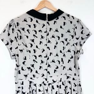 Adorable gray dress with black cat print and black peter pan collar. Zips up the back. 2 hidden pockets sewn into each side seam. Perfect for back to school, Halloween, or just for fun.