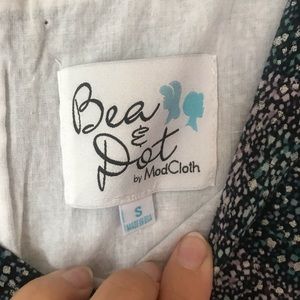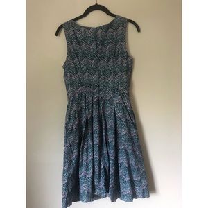 Blue, purple, teal, and silver print. In perfect condition! Great classic cut with flattering waistline!
