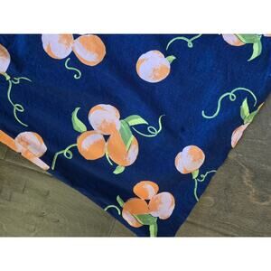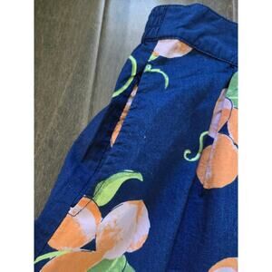 Brighten up your wardrobe with this playful ModCloth A-line skirt featuring a vibrant 195ps inspired peach fruit print on a navy background. Designed with comfort and function in mind, it has an elasticized back waistband for a flexible fit, functional side pockets, and a button-and-zip closure at the front.