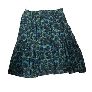 Chic skirt with vibrant blue and green peacock pattern. Perfect for adding flair to any outfit. Lined. Zipper closure.