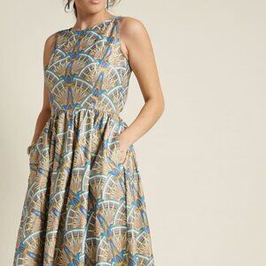 A ModCloth-exclusive print of Art Deco shapes in gold, peacock/turquoise, teal, and purple brings new life to the A-line silhouette of this pocketed number from Retrolicious, and what's more, this darling style is proudly made in LA. Timeless? You bet!