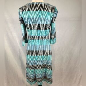 Cotton blend dress with beautiful shades of aqua and blue and an ocean wave design. Surplice vneck wrap top with empire waist. Lined. Euc