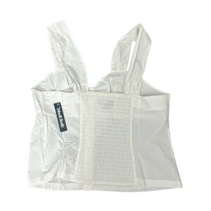100% cotton. Semi fitted top. Sweetheart neckline. Wide straps. Smocked panel to back. Full button front. Semi sheer. Wear with high waisted shorts, jeans or skirt.