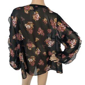 ModCloth Sheer Boho Peasant Tunic Top Multicolor Floral Print Tie Neck Ruffle Blouse Lightweight Long Sleeve V-Neck Chiffon Dressy Indie Bohemian Festival Size 1X