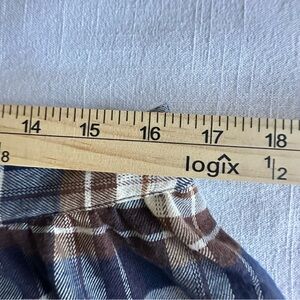 Colors/Pattern: Navy blue, brown, and cream plaid