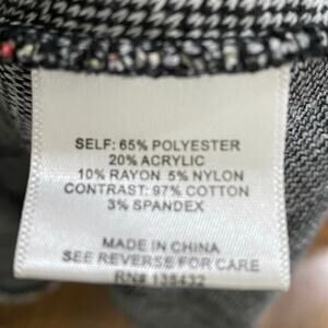In very good condition. 65% polyester, 20% acrylic, 10% rayon, 5% spandex. Machine wash, line dry.