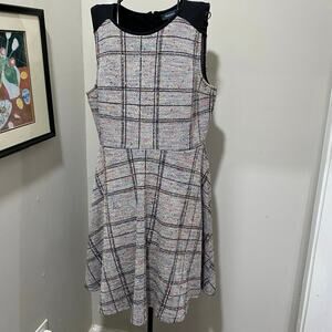 Modcloth stretch knit plaid tweed dress. Sleeveless with black accents at shoulder, back. No pockets. Flared from the waist.