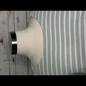 Mint green and white striped pattern; boatneck; short ruffled sleeves; chiffon back tie; straight hem