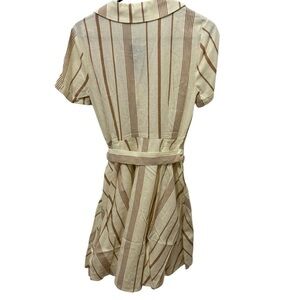 Faux wrap dress. Neutral ivory color. Surplice neckline. Adjustable sash. Linen Blend. Side pockets. Side zipper closure.