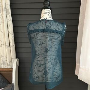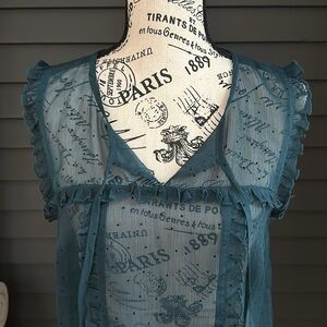 Sheer teal with black flocked polka dot top. Small v neck when open has ties for closed neckline as well