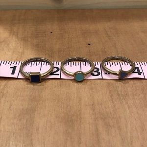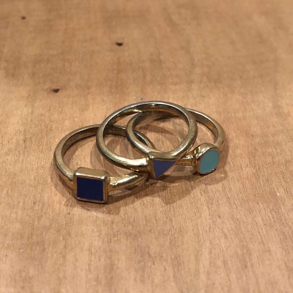 Gently worn (has minor tarnish on inside). Comes with three rings. Each ring has blue shape - navy square, periwinkle triangle, light blue circle.