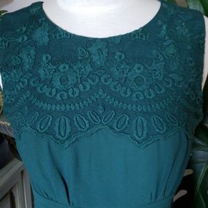 Like new, worn only twice. Adorable A-line dress in a deep evergreen/forest green, with embroidery on the bust and a flattering tiered waist, with pleated skirt. Perfect holiday dress! From a non-smoking home.