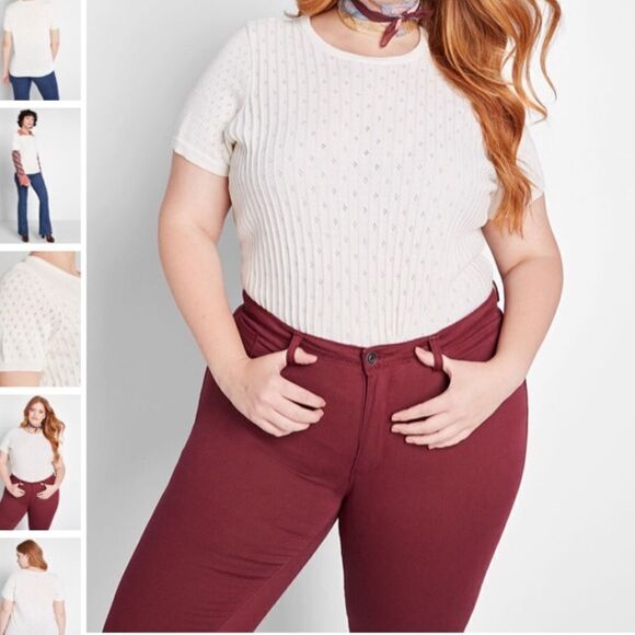 A casual and workwear ivory short sleeve sweater is made from comfy pointelle knit with ribbed trim at the crew neckline, cuffs, and hem. How sweet!