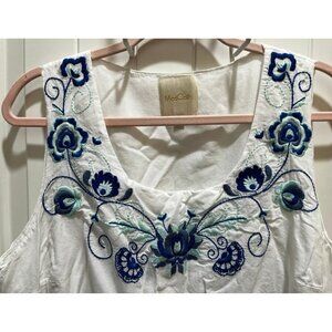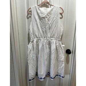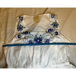 - White dress with blue floral embroidery around neckline and around bottom hem of dress. Drawstring at waist.