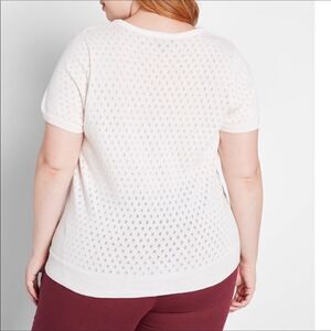 A casual and workwear ivory short sleeve sweater is made from comfy pointelle knit with ribbed trim at the crew neckline, cuffs, and hem. How sweet!