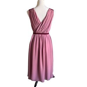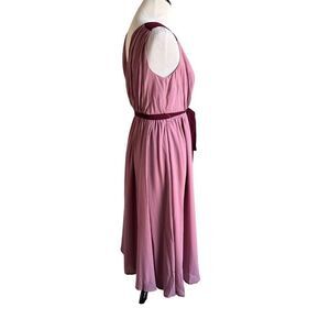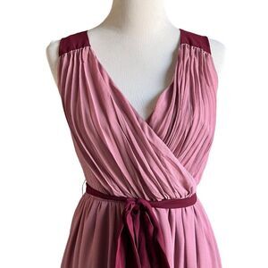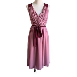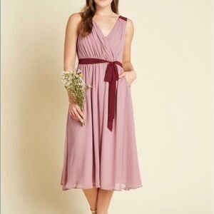 Wholly Romantic Midi Dress The entirety of this rose pink dress, from its burgundy colorblock shoulders and coordinating sash to its swishy midi hemline, is from a dream. A sweet surplice neckline mimics its gathered back, and a pair of hidden pockets completes this lovely-as-can-be ModCloth namesake label piece!