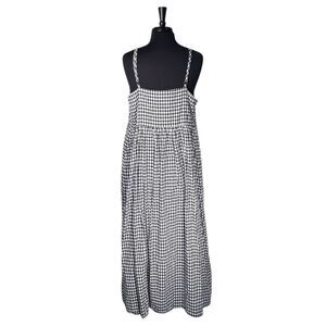 ModCloth Women’s 2X Maxi Dress in navy and white check with textured dot detailing. Crafted from 100% cotton for breathable comfort, featuring a V-neckline, adjustable straps, full button-front closure, and a ruched waist for a flattering, relaxed silhouette. Fully lined for easy wear and perfect for warm-weather outings.