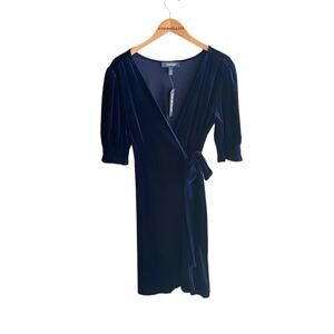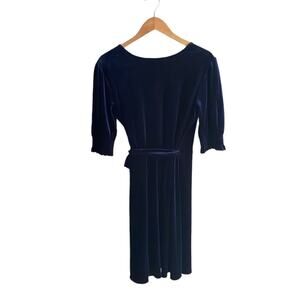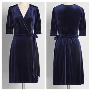Wrap yourself up in this soft, luxurious navy blue velvet mini dress, where simple clean lines meet lush elegance. Smocked detailing at the cuffs with frilly edges allow for fabulous puff sleeves, and the adjustable tie belt cinches perfectly at the waist.