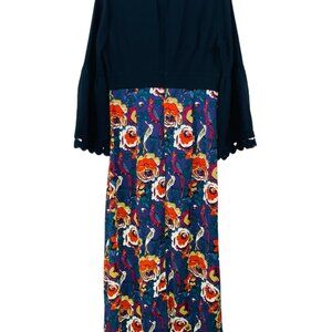 Elegant maxi dress featuring a black top with a vibrant floral skirt. Perfect for any occasion.