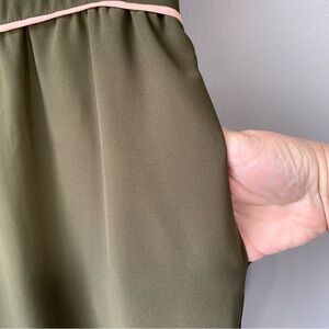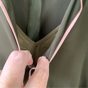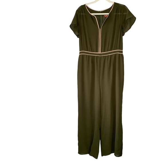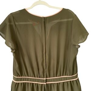 ModCloth army green chiffon jumpsuit with peach trim and flutter sleeves. Size L