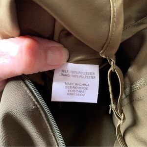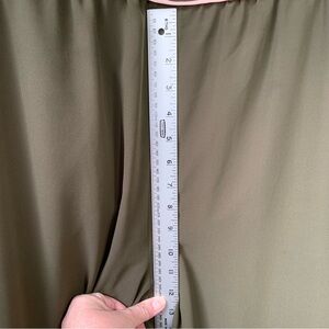 ModCloth army green/olive green chiffon jumpsuit with light peach trim. Flutter sleeves, pockets and wide leg. Flaw- there are a couple of pulls in fabric and at bust there is a manufacturing defect (See pic). It has a satin shell lining. Overall, it’s a beautiful outfit. Perfect for office and then for an evening out! Size L