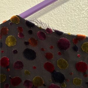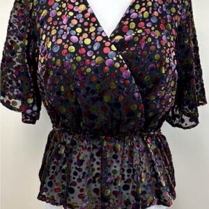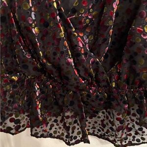 So cute. Flattering fit. Sheer sleeves. Cute velvet feeling circles. On back of neck tiny area of hem is frayed. Trimmed off would not even be noticeable but wanted to point it out