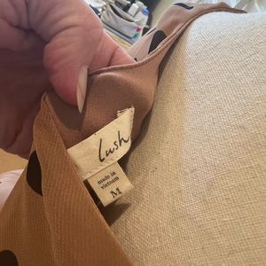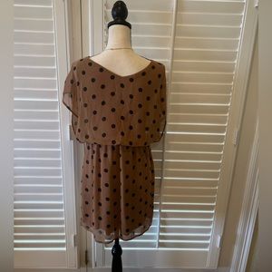 This dress is chiffon with a liner. Waist is cinched. Cute polka dot print. Flowy and perfect for summer. You can even add your own belt to dress it up. Size medium, but will fit a small. I believe I wanted the dress looser on me. I am 32/28/35 and 5’8”. I was a little bigger when I wore this - still a small or xs in clothes.