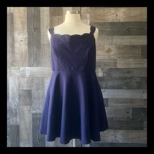 This ModCloth fit and flare dress is navy. It has a unique scalloped look. The dress is gently worn and is in excellent condition!