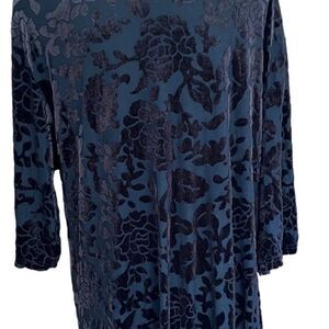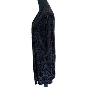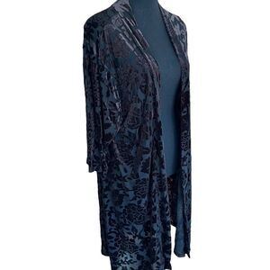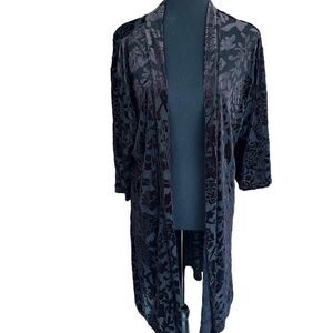 ModCloth open front black floral velvet burnout duster, size S/M. Elbow length wide sleeve, polyester, nylon, and spandex blend, semi sheer. Approximate measurements are pit to pit 21”, length from shoulder approximately 39”. Great for the holidays!!