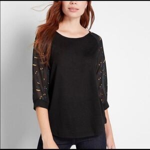 Black T-shirt with sheer pumpkin detail sleeves three-quarter length. Keyhole back with button at neck