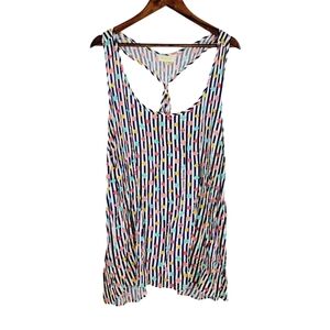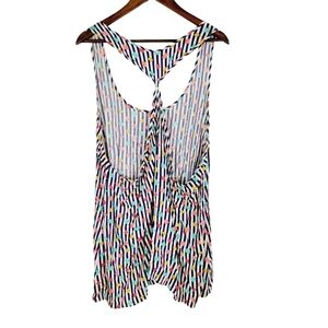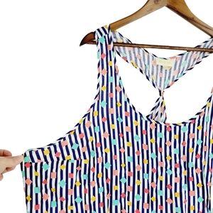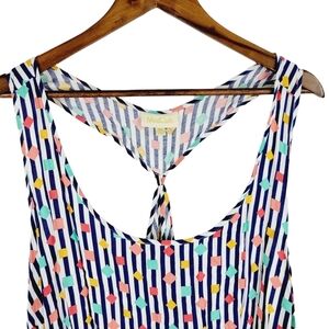 This tank is an excellent condition. It has a blue and white stripe pattern with a colorful square block print.C17