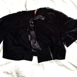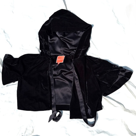 ModCloth velvet crop hooded cape S, short sleeve, bolero, tie front, black, hood