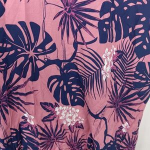 Made from a lightweight, flowy woven fabric, this retro layer makes the perfect swim cover-up for a day spent poolside or seaside thanks to its navy blue-hued tropical print that is made-up of monstera leaves, palm fronds, banana leaves with fuchsia accenting all over, along with white tropical floral blooms scattered throughout.