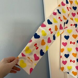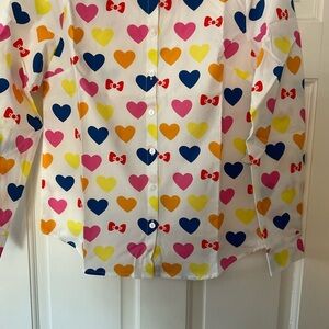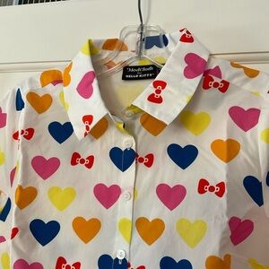 Covered throughout in heart motifs in pink, blue, yellow, and orange amidst a flurry of Hello Kitty’s iconic red bows, this vintage-inspired top boasts long sleeves with button closure at the cuffs, a smart point collar, button-up closure, and a stylish rounded hemline.