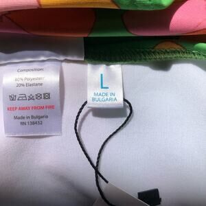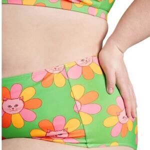 • Featuring a vibrant green background, this swim bottom showcases an exclusive, hand-drawn print of 70s-inspired flowers in pink, red, yellow, and orange, playfully surrounding adorable pink kitten faces.
