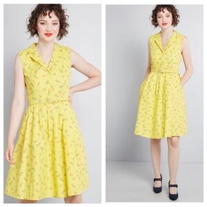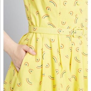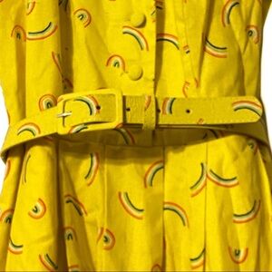 ModCloth yellow rainbow belted shirt dress 00 NWOT. Extra button still attached in plastic and gold safety pin included where tag would hang. Such a super cute dress! Approximate measurements 37” shoulder to hem and 13.5” pit to pit.
