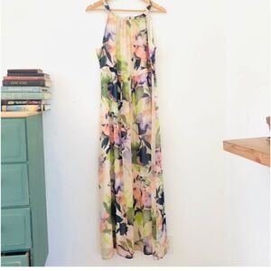 Halter neckline. Delicate pleats are neck and waistlines. Rear zipper with hook and eye closure. Fully lined. Watercolor blossoms pattern.